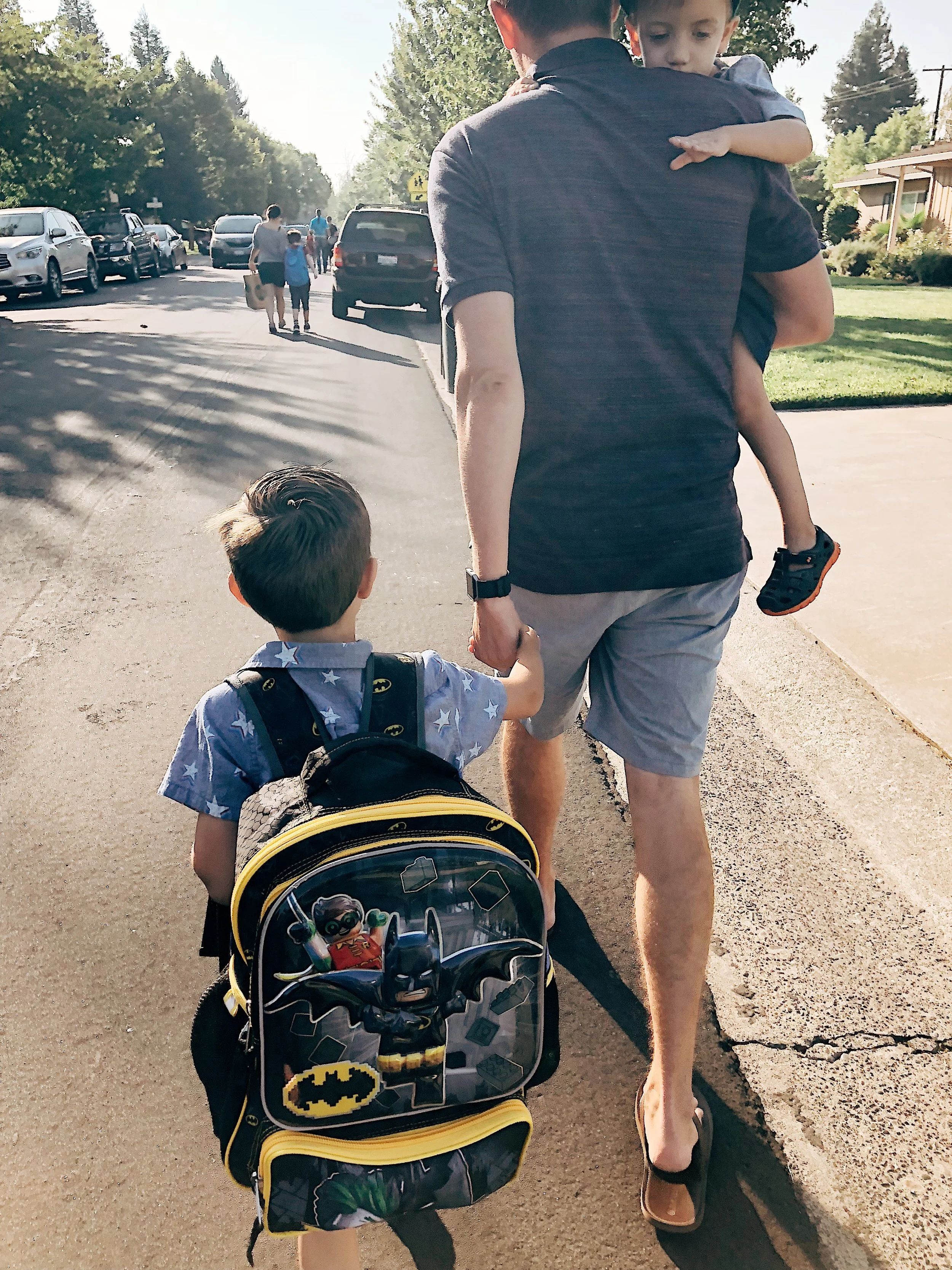 Carson held his hand out in the air for a solid hour, terrified his Sharpie tattoo would rub off if anything touched it. Also: can we please take a moment to appreciate the back view of children being swallowed by gigantic backpacks? Cue lump in throat.