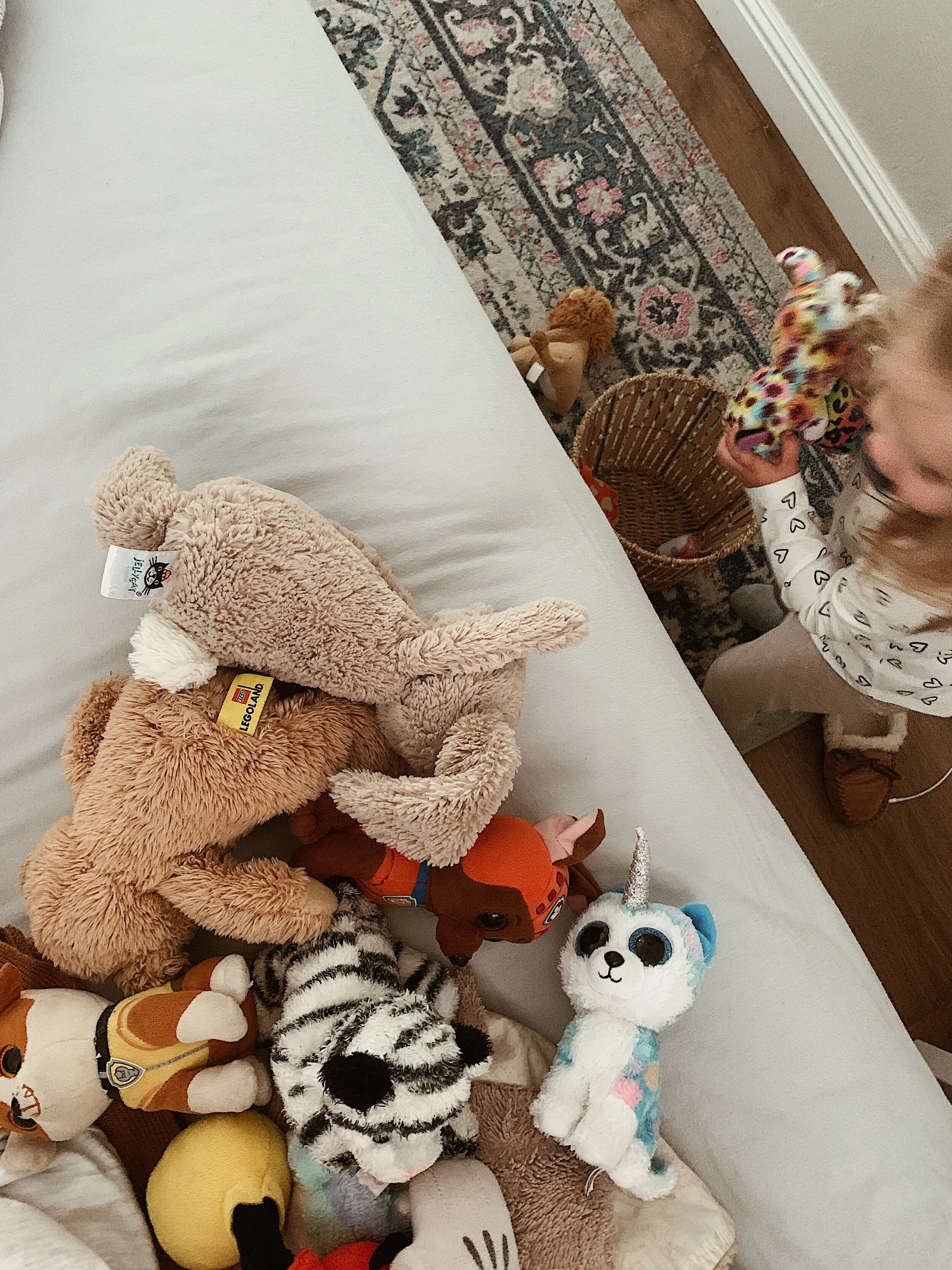 The gesture is so sweet, so impressively intuitive for a toddler, I almost cry. I’ve barely thanked her when she disappears again, this time coming back with a wicker garbage basket filled with stuffed animals. I can’t help but wonder where all the garbage has gone. One by one, she places them on top of the bed next to me, naming each offering.